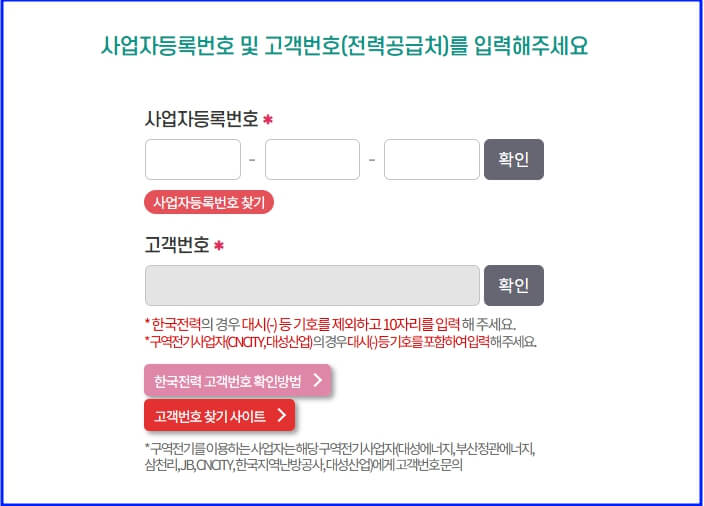 - 신청자명, 사업자등록번호, 전력사용 사업장 주소, 한전 고객번호 등을 입력합니다.